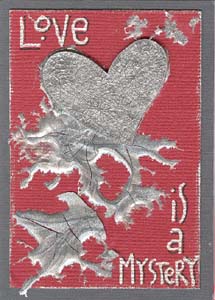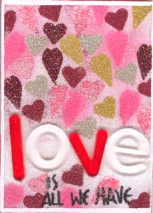 I decided to combine this week's Created By Hand Challenge of "Love" with Paper Pastimes February Theme of "Love/Romance". And again for the color "Red or Pink" for this weeks (Jan 27th) CBH Challenge. The "crackle" ATC's use Ranger's Metallic Crackle paint "Brushed Pewter" and on some I used alcohol inks to color the silver color. On the "Mystery" ATC I painted some crackle paint onto my melt art mat and got this interesting pattern. It pulled away from the slick surface of the melt art mat creating interesting tentacles which I glued onto my ATC using Golden's extra heavy gel medium. The hearts (mat board) are punched out with a Sizzix die and the word LOVE (Zyroned cardstock) is a Sizzlets die, both punched with my Cuttlebug. On the Ritz Glitter ATC's I punched out and applied masks or cut away the release paper. Abbreviations: BM - Bazzill Monochromatic cardstock, |