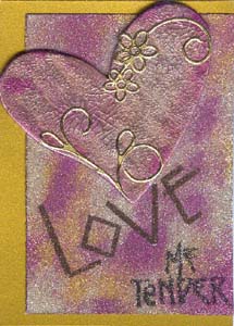 This is another done with the 2.5" tape and the word "Love" cut out of the release paper, sprinkled with a Bronze Ritz glitter and then the rest of the release paper removed and sprinkled with 3 colors of glitter. The words "me tender" is done with a Sharpie. I added some gold Peel Offs on the crackled heart. Mounted it to a gold metallic cardstock. |