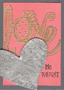 Just picked up this new clear alphabet set from Inkadinkado "Doodle #97730" to rubber stamp the word "Love" in gold and Queen's Gold embossing powder on a med toned pink BM. Mounted it to the deep grey linen cardstock. The words "me tonight" done with a micron. |