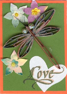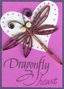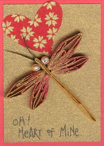 Another week's batch of "Valentine" related ATCs. This week's (Jan 27th) CBH Challenge is to use the color "Red or Pink" CBH Challenge. I went to a another quilling class and learnt the "husking" technique. Very easy and lots of potential. The 1st dragonfly is done with your basic quill strips in a burgundy tone which I embellished with "warm highlights" Ritz Glitter. The eyes are enhanced with Stickles "Crystal ice". The white heart is a pearlized white paper which I punched out with a Sizzix die and then punched small holes around the edge. Rubber stamped the "Dragonfly" word (Quietfire design) with Versamark and added the word "heart". Done on a deep pink cardstock and then mounted to a purple cardstock. The 2nd dragonfly is done with strips of Oriental Paper that I double layered prior to cutting into strips. Punched out the flowers from some decorated paper I had made eons ago. Same heart paper as above. The word "Love" (Quietfire Design) is double stamped, once with a Versa Magic stamp pad Pumpkin and then with Olive Green. Done on med toned green cardstock then mounted to orange cardstock. The eyes as above and the centers of the flower with a Stickles Yellow. The 3rd dragonfly is done with another Oriental paper also doubled up before cutting into strips. This one's a red with gold Sakura flowers. I ran a wide glue stick over the wings and sprinkles gold Ritz Glitter. Added the words with a Micron pen. Punched out the heart with the same Oriental paper. Done on gold irridescent cardstock then mounted to a bright red. Same eyes as above. |