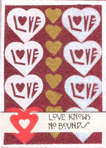 Again I used the 2.5 wide tape. Stuck on the plastic letters for LOVE, then stuck on punched out release paper hearts all over, removing them as required for each color. This was done on doubled white cardstock. |