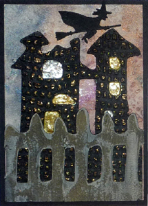 The background sky area is a gorgeous background I made ages ago and can't remember what I did... but it looks like it was done on heavy cardstock or watercolor paper, watercolors and salt. really nice pinks, and smokey tones. The backgrounds were mounted to black cardstock. Houses and fence cut on my Cricut. The houses from black cardstock, embossed with Mesh embossing folder and brayered on the high points with perfect medium and embossed with gold. Windows were filled in with 3D fabric paint in a yellow and a pearl white. |