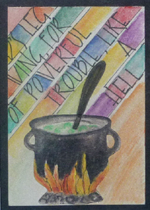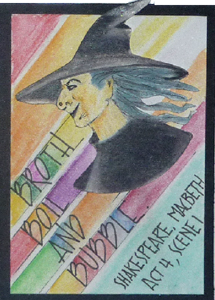 I love this quote (although I didn't have room for the beginning of it "Double, Double...") I cut out the witch's head and cauldron with my Cricut, drew in my linear details, then colored them in with Prisma colors. Wrote the quote with a Micron black pen, then colored with Derwent watercolor pencils and a water brush. Mounted them to black cardstock. |