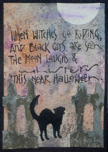 Fence was cut from Grungepaper, painted with Distress Crackle Pumice Stone and when dry, painted over again with white crackle and smeared. Witch, cat and bat are Martha Stewart punches from black cardstock. I then added a white half paper circle for the moon and put in some cloud wisps. Words: When witches go riding, and black cats are seen, the moon laughs & whispers, 'this near Halloween. |