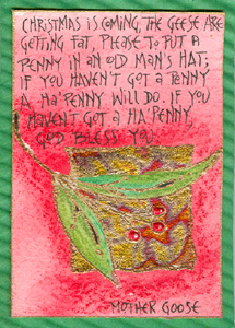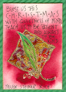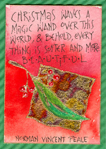 I have this rubber stamp (Artful Stamper "Misletoe #CM1231Q) that has 3 squares on it with misletoe leaves in each. I really like splitting them apart and then reassembling the way I like them... In this case as individual items on my ATC's. I used Arches 140# CP watercolor paper and rubber stamped each with Brialliance Pearlescent Rust (my gold needs a reinker which I don't have -sigh) and Queen's Gold embossing powder. I then colored them in with either Derwent watercolor pencils (which didn't work as well as expected on this paper) and then Winsor & Newton watercolors (much better). Then applied some red variegated gold leaf in the background of each square. Used 3 D fabric paint in a shiny red for the berries, when dry added a dot of Ranger's white Inkssentials pen. wrote in my quotes with a black micron pen then mounted it to a bright green cardstock which I ran through my crimper. |