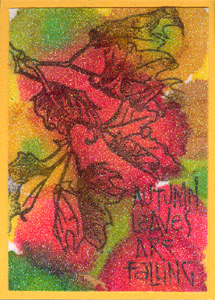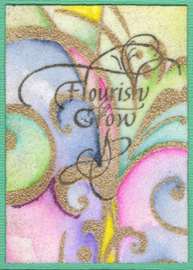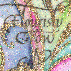 So they all start the same way on white 65# cardstock. A layer of 2.5"w sookwang double sided tape (Be Creative Tape). A layer of Glitter Ritz micro fine glitter (cool Highlights - can use warm highlights too). Burnished really really well. It should feel like a baby's bottom, so smoooooth. Clean off all excess glitter that wouldn't shake off into the jar with a damp paper towel. Now starts the coloring: Flourish & Grow: I rubber stamped the large flourish (Inque Boutique Monarch #52001 set) with a gold pigment stamp pad and embossed with gold. I then colored with Bic Mark-it alcohol based pens and Ranger's alcohol blending solution and moved around with an empty waterbrush. That purple line on the bottom left hand side was too dark in my opinion, so I started by dampening the paper first with the solution and then touching the tip of my brush onto the pen tip and coloring that way, then adding more color straight with the pen and blending some more. Rubber stamped the words Flourish Grow (Quietfire Design) with the black stamp pad. Mounted to a bright green Textura cardstock. See detail pic below. Autumn: I used alcohol inks straight from the bottle and dripped drops onto the glitter, letting it dry and adding different colors or blending solution into the center of the drops, letting dry and continuing this way several more times. Then rubber stamping the leaves (The Stamp Barn #CHSH2671) with a Versafine Black Onyx stamp pad and clear embossing it. Mounted it to a bright yellow cardstock. Wrote in my words with a black Zig Writer. ByGone Days: Rubber stamped the flowers and butterfly with the black stamp pad and clear embossed. Colored with Tombow watercolor markers and moved them around with a waterbrush and water. Added the words with a dark blue Zig Writer. Mounted to a bright blue cardstock. PS you can use other watercolor media as well, like Sakura Glaze gel pens, or even the Metallics and Stardust pens, ArtQuest watercolor Palettes etc. |