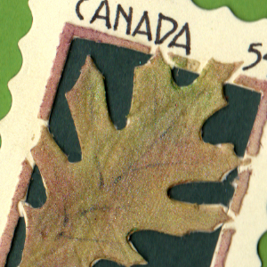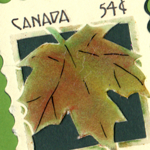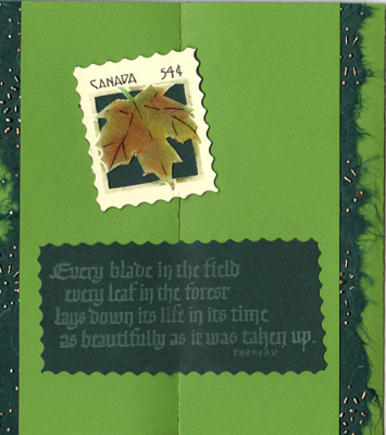 I used 2 pieces of an olive green cardstock, folded them in a gate back fold manner. The first fold was made ate the 2.5" width and the next fold at 3"w so it extended slight from the first flap and you can see the gold embossed green mulberry paper peeking out. On the inside I used the same dark green cardstock as the piece that has the quote on the front, to bridge the two flap pieces (see pic below). I rubber stamped the Quietfire Design Quote "|Every Blade" using Staz-On Buttercream stamp pad on the dark green cardstock and used a scallop edged rotary cutter to trim the edges. Adhered it to the right hand flap. The maple leaf is one of three leaves on a Lynell Harlow Dreamweaver brass stencil. For this one I used Pebbles Pearlescent chalks and the Translucent Dreamweaver paste. Trimmed with the scallop rotary cutter. All three had Sookwang tape put on the backs, then the negative portions cut out and mounted to the dark green cardstock. The words "Canada 54¢" done with a black Micron pen. added the veins with a black Identipen. The other two leaves had a layer of white embossing paste put down, let dry then colored with Pebbles Cream Chalk Precious Metals set. |