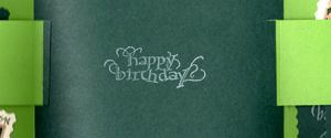 Both of the quotes inside (Quietfire Design "What is a weed.." & "Every End..") were stamped with Brilliance Moonlight White stamp pad on dark green cardstock, trimmed with the rotary cutter. The portion of the card that I cut off is what I used for the insert inside. I cut off the flap sections from the main piece and adhered them separately. Punched out the square holes for my ribbon and did the borders with a Martha Stewart order punch. Added the Peel Offs "Just for you" sentiment. It is one of my white calligraphic sentiments colored with Copic Ciao markers. |