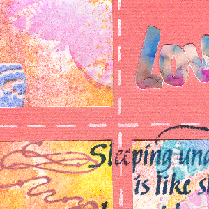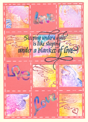 "Love Quilt" card The quote on this card is such a nice warm quote. I just can't help making cards with quilts on them when I use it. Note all stamps are from Quietfire Design I started with white cardstock and rubber stamped the large and small butterflies all over half the sheet with Perfect Medium, then clear embossing it. Brayered Adirondack Dye Rainbow pad "Cabin Fever" over it, spritzed with water to merge the colors, heat dried, then ironed of the clear embossing between clean pieces of newsprint. Rubber stamped the butterflies over the original ones which are white now with Kaleidacolor "Birthstone". Gives a nice subtle white edge to the butterflies. For the other half of the white cardstock, I rubber stamped the heart flourish with Versafine Crimson Red and clear embossed. Brayered it with Autumn Sunset, removed the clear embossing as above. Cut 1.25 inch squares and mounted them to a peachy/pink Bazzill monochrom cardstock, keeping the spaces between the squares neat and equally spaced. Used a white Inkssentials pen to draw my faux stitching lines. Used my Cricut with some scrap alcohol background paper that was in similar tones, to cut out the word love using various fonts. Adhered them to the card. Rubber stamped the Quilt quote with Versafine "Blue Lagoon" and clear embossed it. Mounted this to a cream toned main card.