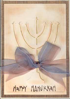 "Happy Hanukka" card Well I finished all my Xmas cards so making another one was not high on my priority list. But then I thought, OK, most of my relatives are Jewish, but I give them non denomination cards, so I thought I'd give one of them a traditional card. I found an image of a Menorah on line and manipulated it in various programs and then cut it out on my Cricut on white cardstock. I did this 4 times, glue one to the other, both the positive images and the negative pieces. I was making myself an embossing template. I ran it through my Cuttlebug with Stonehenge cardstock. I preferred the impression I got with the negative design. I then cut one more template so I could use it to shadow my menorah with a sponging tool and Distress "Tea Dye". I then did a very small outline with a Quickie Glue pen and Bronze Ritz micro fine glitter. Wrote my words Happy Hanukka with the glue pen and the bronze glitter. Mounted this to a linear patterned bronze metallic paper (available from Quietfire Design). Tied a gauze ribbon (smoky blue / pinky bronze) arouned the layers, then mounted it to my main cream toned card. |