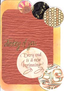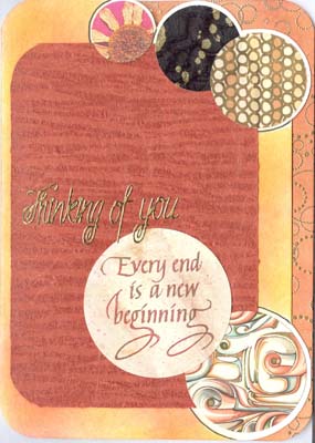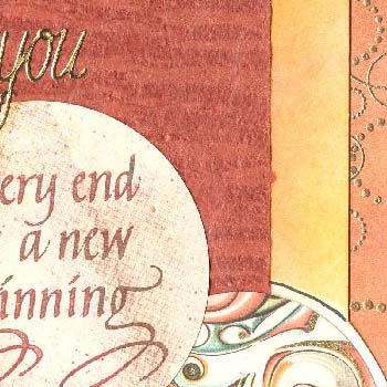 The inside border was done with Pan Pastels and then I rubber stamped the circle border (Hero Arts clear Foloral Border stamp set) with Brilliance "Coffee Bean" and embossed with Queen's Gold embossing powder. Added some gold toned parchment paper, right to the border edges.