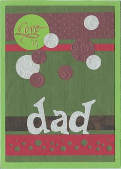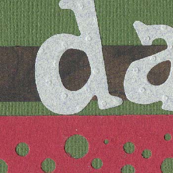 5"w x 7"h I used various circle punches, EK Success border punch "Swiss Cheese", Sizzix Alphabet Dies (Fun Serif lower case), Cuttlebug embossing folders (Spots & Dots, Swiss Dots), all on various plain cardstock in red, brown, green & grey granite. I also used a piece of brown marbled paper from I believe Sonja Idema. Layered all these on a dark olive toned cardstock then onto a bright green cardstock. |