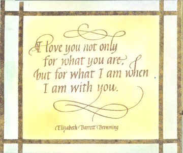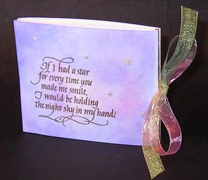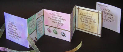 All stamps and products available from Quietfire Design The ribbon is attached to the back of the front page and goes through a slit in the fold. I didn't want to cover up any portion of the front, then wraps around the back page to tie on the edge. PS to get quotes aligned straight on your page, align the rubber stamp on your acrylic block so the written line is parallel to a straight edge. It really helps. |