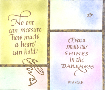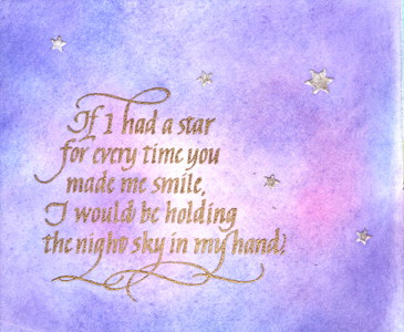 I used white cardstock, cut in half hot dog style, then scored at 5", leaving a small tab on one end. I lay down a piece of double sided tape on this edge and trimmed close to it, then adhered my next folded piece of cardstock. I continued this way until I had 7 pages, trimming off the last section. As you can see from the pic above, the front folds away from you (the reverse of a regular card) and the last page faces you with nothing on the back of it. I used Pan pastels and a dried out Baby Wipe - Costco brand. If you look closely you'll see that I color around the edges, leaving the central portion either the white of the paper or so light it almost looks like the white of the paper. I feel this gives an inner glow to whatever I put on there. I used a lot of tint colors to get a soft look with just a bit of the pure colors along the very edge of the pages - I didn't want to over power this card with vibrant colors. I used Peel of Sticky Shapes "Stars" and some glitter. Thermal embossed the quote with gold embossing powder.