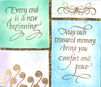 I rubber stamped each quote onto a piece of tracing paper so I could manoeuvre them and decide where my vertical and horizontal lines would go. PS: If you notice I also used only Italic type quotes. There is no problem using a combination of different lettering styles, just don't do all italic and then just one of something else. It will stand out and look unnatural. Intersperse the italic with a few of something else so they balance out. I put a light pencil mark for my edges on my cardstock and then lay down the double sided 3mm tape (love this stuff). Colored in the areas with the Pan Pastels, rubber stamped the quote with a fast drying stamp pad ink. Removed the release paper from the tape and sprinkled a gold and bronze glitter, rubbing the two colors to merge and blend them. Rubber stamped the fiddleheads and flourish and gold embossed them. |