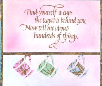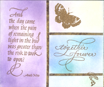 The teacups, I cut out of a piece of cardstock to create a stencil that I could use to color the cups and then as a mask to rubber stamp some flourish designs which were also gold embossed. Did them on a tilt to mimic them hanging in a cupboard. Love this quote. Rubber stamped the butterfly and mini flourish heart and gold embossed them.