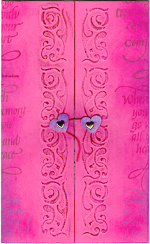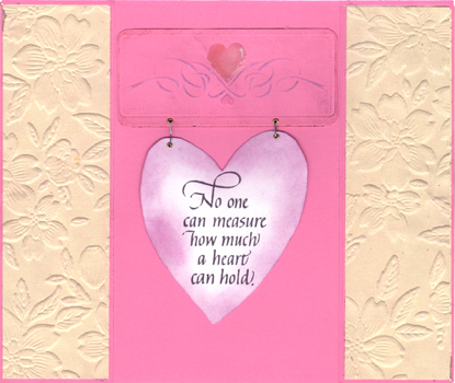 The inside on the gate doors I adhered some heavy textured floral paper, leaving a border of the pink all around (it also served to hide the brad closure on the inside). I dry embossed the heart with flourish, also Dreamweaver # LM125, then colored it with Pebbles Pearlescent chalks. Adding a touch of Ranger's white Inkssentials pen for highlights olong the ribbon and heart. Added Glossy Accents for the hearts to make them pop and shine. The Quote "No one can measure" (also from Quietfire Design) was done on a white cardstock with Versafine stamp pad "Imperial Purple" and the heart cut out, then the edges colored with the Pan pastels. I added mini gold eyelets and attached the quote heart to the embossed heart with staples, adjusting the length for the off shaped heart. (Couldn't find my colored staples, so had to resort to normal staples - sigh). Adhered only the top edge of the embossed heart section to the card. The heart flips up so a personal message can be written and stays secret... |