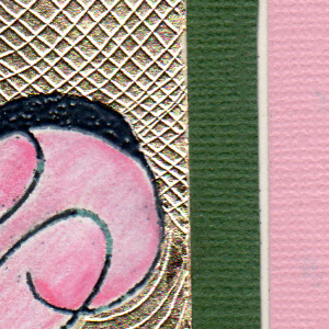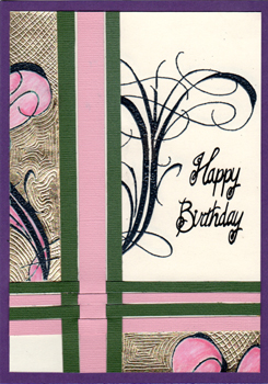 5"w x 7"h I used two colors of Bazzill Monochromatic cardstock in pink and olive tones. Used some Sookwang tape on the back and cut out my various width strips. Wove them and stuck them down to my cream toned cardstock. Rubber stamped the large flourishes (Quietfire Design Flourish set) masking and protecting the areas I didn't want the stamping to go on and then thermal embossed them with Hematite (like black) embossing powder. Lay down my size, Mona Lisa size with a touch of yellow gouache, which gives a warmer under layer to the gold and is easier to see when applying it. Used composition gold. All gilding supplies are available through Quietfire Design. Added my dry embossing design elements, then colored in some of the flourishes with colored pencils.