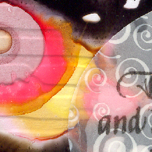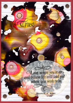 "Alcohol Ink Ross" card I've been playing with alcohol ink s on some plastic (Grafix .007 thk Clear Craft Plastic) I bought and loving the results. This is one of them. Note, word and quote are both from Quietfire Design. I dropped Adirondack alcohol inks onto the plastic either straight from the bottle or onto a very tiny paintbrush so I could gently touch the preceding drop. I used Butterscotch, Carmel, Watermelon, Espresso, Pitch Black, Gold Metallic and blending solution. When I was happy with my splotching, I trimmed it to my card size. I ran a piece of white cardstock through my Cuttlebug with the Distressed Stripes embossing folder, burnished an area down for my word "Trust" and rubber stamped it with Versafine Black Onyx, then adhered my alcohol ink art (glossy side up artwork down) with four old copper style brads in the corners then adhered this to my main deep red textured card. Rubber stamped the quote with the black onto swirl patterned vellum and clear embossed it, mounted to card with Diamond Glaze. |