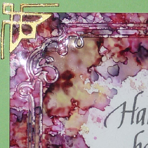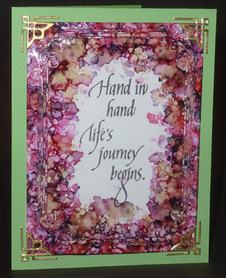 "Red & Green - Hand in hand" card This weeks theme is Red & Green. If you've seen my recent cards, you'll know I've been following Tim's 12 days of Christmas tags again this year. Lots of wonderful techniques and ideas. This card uses the clear plastic packaging through an embossing folder on his day 10 tag. I went a step further and used alcohol inks on the back of it to frame my quote. I used Red Pepper, Raspberry, Citrus & Pesto alcohol inks on the back of the embossed plastic using a Cuttlebug's Grace's Frame. Adhered it to white cardstock which I stamped the quote (Quietfire Design.) with versafine Black. Layered that onto the green main card. Added gold Peel Off corners This was a very quick and easy card. |