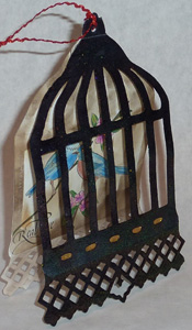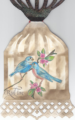 I used the Spellbinder's Borderabilities Lattice Border and die cut if from some cream cardstock, inking it with black and embossing with holographic. Adhered one to the front and one to the back of the card with double sided tape. On the front I added Ritz Glitter micro fine glitter Dark Gold in the little holes. Attached the front to the back at the top, but found it became very week, so added a piece of linen hinging tape on the inside. Also added a second solid image birdcage to the back of the card to add strength. The inside back of the front was also inked with black and embossed with the holographic. I rubber stamped part of the quote "Real Love Stories" (Quietfire Design) with Distress Walnut Stain and clear embossed it on the bottom of the card. It's hidden when the card is closed. And finally added a red rickrack tie.