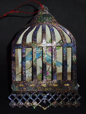"Birdcage - Real Love" I've been wanting to do a birdcage for a while now, not necessarily as a card, but that's what I created this time. I found a basic birdcage image on the net, altered it and cut it out with my Cricut. I then covered it with black pigment ink and thermal embossed with Holographic embossing powder. I cut another birdcage (solid image) for the back from cream cardstock, and used the first one as a stencil to lightly sponge color to the inside with Distress stamp pads. I rubber stamped the birds (Martha Stewart 2 bird stamp set) inking parts of the stamp only where needed with Versafine Black Onyx and clear embossed it. Then colored them with colored pencils. Then sponged more Distress colors, using the the fall out pieces as masks. I added very small amber faux rhinestones for the eyes.
