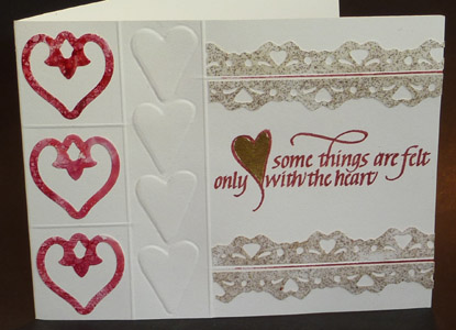 "Heart - Some Things" card Well I've had enough of Xmas/winter and thought I'd speed up the coming of spring by starting on my Valentine's day cards. I started by cutting out a bunch of hearts with my Cricut and adhering them to a piece of cardstock which I then used as an embossing plate through my Cuttlebug on white cardstock. I used a Spellbinders Shapeabilities Pendant "Spades" #S4-208 to cut the three red hearts from background paper done with an alcohol treatment. I then used my Scor-it to create pronounced raised lines separating the hearts within squares and rectangles etc. I put two horizontal lines in the right hand side. I punched out the heart borders (EK Success), and thermal embossed them with a mix of Clear and Queen's Gold embossing powder and put them above and below the horizontal raised lines. I then rubber stamped the quote (Quietfire Design) with Versafine stamp pad "Satin Red" and clear embossed it. Also put some color on the horizontal raised lines. Added some 23.5kt gold leaf in the heart. |