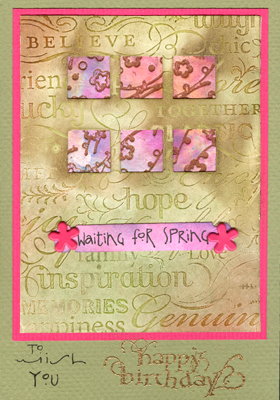 Birthday" card I often look out my windows, wishing it were spring, so I thought for this theme to put some windows on my card. I used the Sizzix Shapers & Movers windows. Then I stamped the words with a - BIG - Stamping Up background stamp "Tres Chic" #109258I using Perfect Medium and clear embossing it. Colored most of it with Pan Pastels in browns and olive, then touched the window frame areas with Distress Walnut Stain. I adhered a piece of decorated rice paper (on the back) I did a couple of days ago using my new Cuttlebug Asian folders (Plum Blossom). You can see all of the other samples HERE. Wrote in my word on the tag and attached it with the floral brads, then mounted this to a deep pink textured cardstock, then onto the sage toned textured cardstock. Worte in the words "to wish you" with a black micron pen and then rubber stamped the words "Happy Birthday:" (Quietfire Design) with Versafine Toffee and embossed with Queen's Gold. |