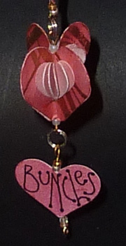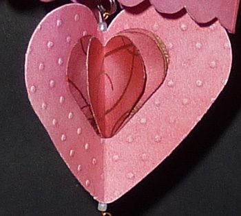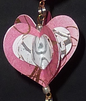 I colored white cardstock with Pan Pastels in red and touches of magenta, rubber stamped with the large and small flourish Quietfire Design) and thermal embossed with Queen's Gold. Another piece of white cardstock I left white, ran through the Cuttlebug with the D'Vine Swirls folder, brayered the raised edges with pigment ink and thermal embossed with silver. I punched or cut with my Cricut various sizes of hearts. I ususally put approx 5 smaller hearts within a larger heart, then either grouped them in 3, 4 or 5's. I folded each heart in half and bone folded it down. I used white glue, and just smeared a very thin coat along one half of the back of the heart, and sandwiched to another 1/2 portion of a heart, making sure the edges matched. I kept doing this till I had about 5 hearts together. Then I adhered this batch to the center fold of a larger heart and put that aside. Continued doing this till I had the number of groups I wanted for my finished heart. Adhered them to each other. I glued a bead to the top and bottom of the heart and inserted a wire through the heart and beads, then made loops at the top and bottom. The very large heart at the top has 3 groups. The large hearts were also run through the Cuttlebug with the Swiss Dots folder. The small one at the bottom 4 groups. The small hearts within are plain only colored with the Pan pastels. |