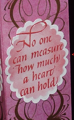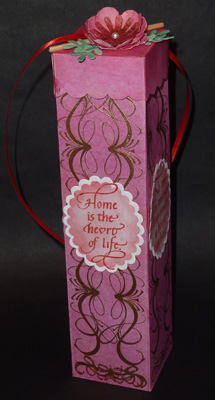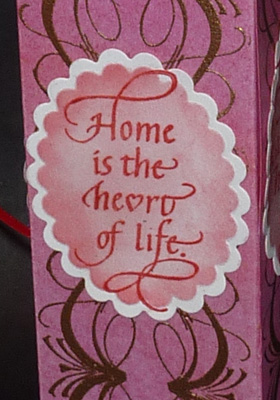 I rubber stamped the quotes using Versafine Satin Red on white cardstock and used the Spellbinder's Classic Scallop Large Nestabilities (the middle size), positioning it and taping it to my opaque plate. Die cut it then dry embossed it, then colored it with Distress Worn Lipstick using a sponging tool, dark around the edges and a little lighter in the center, then thermal embossed the whole thing with clear. The front and back are the same "Home" quote, and the two sides are another quote "No One". Adhered them to the box with double sided tape.