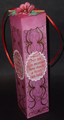 Mirror Dangly Well this challenge started out with the smallest 3D heart ornament, and then I made the large one and thought the difference in size was too great, so made the medium one which was cut out with my Cricut, because I didn't have the right size heart punches for that one (I only have about a dozen heart punches). So they're laying on my desk and I'm thinking what to do with them. Then our challenge theme of boxes came up and I thought I'd make a box to hold a dangly. And I'm looking at the dangly and saying it would look great as a rear view mirror dangly and the tall box was created. This rear view dangly is better than some I've seen... The box is made from 110# value white cardstock. Scored with my scor-it tool at 2" increments with 1/2" for the flap, and the bottom scored at .5" and then 2.5". I cut off the excess bottom section making sure I had a .5" flap on each side of the bottom to use as flaps. Colored the cardstock with Pan pastels for several reasons. Great coloring tool, and is a great anti static powder for all the thermal embossing I was going to do. The top is a smaller piece of white cardstock approx 4" square, scored at the 1" and 3" marks both horizontally and vertically. Then cut along one side of each flap section. I trimmed the edges by hand, but I guess I could have used a square scallop Nestabilities had I thought about it or had one or even my Cricut. Sheesh. I then used the Pan Pastels to color it. I rubber stamped the large flourish border (Quietfire Design) with Versafine Toffee and embossed with Queen's Gold, doing one side at a time and positioning by eye. Then I added the small bottom flourishes. Sprayed the top and box with Krylon Workable Fixative. Let dry. |