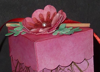 For the top, I punched a 1/4" hole to slip my ribbon in and would be big enough to slip out again with a knot in the ribbon. Slipped a piece of bamboo skewer through the knot to hold it in place and left the ends just dangle. When the box is opened the lid and dangly inside look like one piece. For the flower I punched out (actually cut with my Cricut) a bunch of hearts from some leftover colored cardstock. Made a slit between the scallops of the heart and about half way down into the heart. Then with a clay shaping tool (The rounded end - see pic at right) and a thick layer of Fun Foam, shaped the petals. Adhered them onto a small circle (just to hold everything together), overlapping one to the other, Then did a second layer off setting it slightly. And wouldn't you know it, my daisy punch wouldn't work, so back to the Cricut to cut out two sizes of daisy type flowerets from some of the dangly decorated cardstock (with gold flourishes), both of which I added deeper tones of red with Distress Mahogany and a sponging tool both on the front and back. I then formed them and adhered to the center of the flower. Added a medium sized half pearl. Adhered it to the the top of the box on the petal section rather than the bottom of the flower so it would have a raised effect. Slipped in some fern petal leaves with the EK Success punch. |