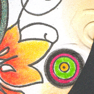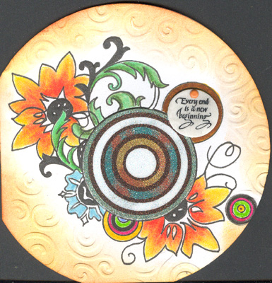Colored the floral elements with Prisma Colors, and the connecting circles with Tombows. Sponged Distress stamp pads Mustard Seed & Rusty Hinge around the edges, then used my Sizzix Swirls embossing Folder and my mallet to dry emboss the edges. Cut out a circle from white Shrink Plastic, sanded it down, rubber stamped the quote (Quietfire Design) with Versafine Black Onyx, punched a large hole, then placed in oven to shrink. Attached it to the card with a mini orange brad. |