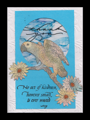 Cut out a circle at #85 using my EK Success Orbis Circle Scissors from both the blue cardstock and on the front of my main white card. Trimmed down the blue one to fit within the confines of the card, matching the circle opening. Rubber stamped the quote (Quietfire Design) at the bottom with the black and clear embossed it. Rubber stamped the "Thank You" also from Quietfire Design, first stamping on a piece of tracing paper so I could position the word to peek through the window where I wanted it, then stamped with the black and clear embossed. Used a Cuttlebug Folder "Victoria" #37-1916 and my rubber mallet to emboss the design around the edges of my white card. Used a piece of left over Graffix Clear plastic I had streaked with Alcohol Inks to simulate a cloudy sky (Pool, Sailboat Blue, Denim, blender & a dirty felt with some magenta on it). Adhered it to the front of the card over the opening. Adhered my blue piece over that. Adhered my bird elements, on the plastic I used Glossy Accents and on the cardstock sections I used PVA. As a final touch I added some Copper Micro Fine Glitter for the centers of the flowers. |