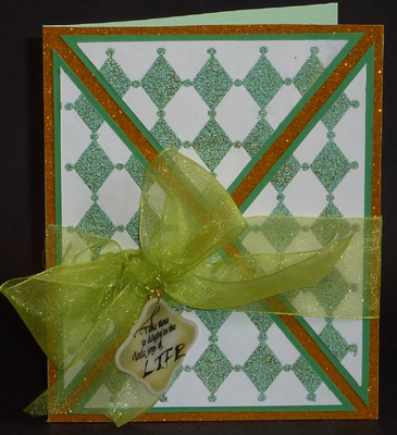 ""X" Life card So I thought I'd play on the shape of the letter "X" rather than come up with something to do with Malcolm X... Rubber stamped the harlequin background pattern (Quietfire Design) with Versafine Olympia Green and embossed with Green patina. Cut my diagonal lines to create my shapes, mounted them to a deep bright green, trimmed it down and then mounted it to a golden copper metallic cardstock, which was then mounted to the front of my main light green card. Wrapped a wide green gauze ribbon to the inside of my card. Tied a bow and adhered that separately. Final step was to die cut a piece of translucent shrink plastic with a Spellbinder's label Thirteen die, rubber stamped part of the quote (Quietfire Design), and the word "Life" (Just Jhones "Attic Treasures" set) with Versafine Black Onyx, punched a hole and then baked it and attached it to the ribbon with a gold jump ring. |