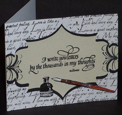 Letters" Loved the theme so made my card early BIG GRIN. I also got to use one of my Tim Holts On The Edge dies. Love it. This one is called Ornate #656626. Rubber stamped the background on white cardstock with a text stamp (Local King Rubber) with Versafine Black Onyx. I die cut some pearlized white cardstock on one edge, then turned my cardstock around and die cut the other side. Did the same for the black cardstock underneath, but cut that one slightly larger. Then I rubber stamped the quote & used one of the flourishes (Quietfire Design) with the Black and clear embossed it. Rubber stamped the pen and ink well, also from Quietfire, with the black, clear embossed it, cut it out and colored the pen with some red colored pencil. |