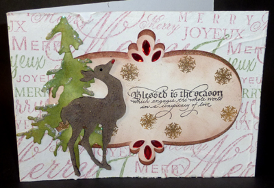 Tim's reindeer was die cut from mat board, colored with a Tombo watercolor marker, dark brown, then a layer of Frayed Burlap crackle medium, then Distress walnut stain rubbed over it when it was dry and then buffed. Added a red nose with 3D fabric paint and a black eye with Enamel Accents. I did cut the Sizzix Frame Back Ornate #3 twice from white cardstock. Sponged Distress Aged Mahogany heavily on the back piece and cut that one in half to create a shadow type border. Then I sponged mahogany on the front piece, stamped the quote with black, stamped the snowflakes with Toffee and and embossed with Queen's Gold. Some of the gold embossed onto the 2nd layer which gave a nice glitz to that piece. Layered them to the card and added the red rhinestones. |