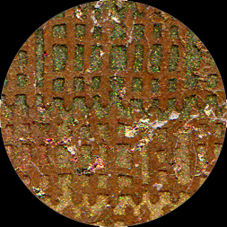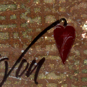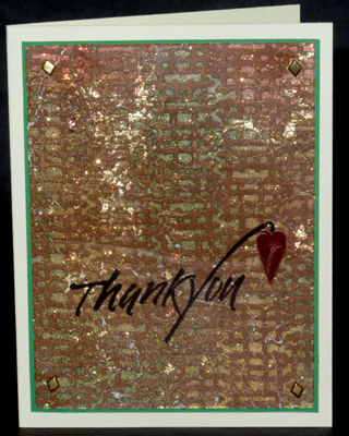 So I punched 6 rows of fence ribbons on white cardstock, taped them at the top and bottom to another piece of white cardstock, then sprayed them with various spray paints (Color Wash Butterscotch, Tattered Angels Glimmer mists "Coffee Shop & Peach Perfect"; Tsukineko Walnut Ink "Terra Cotta & Eucalyptus"). Dried that, then sprayed gold & white webbing all over. Then a bit more webbing and some variegated gold leaf. Sprayed a piece of cream toned cardstock and the back of the fencing with Spray Adhesive, then adhered them together. Sprinkled various colors of Ritz Micro Fine Glitter and burnished well (Gold, Peridot, Sweet Basil & Orange). Bummer you can't see the the beauty of this background. Layered this onto a bright green cardstock. Stamped the Sentiment (Quietfire Design) with Staz-on Black on clear Graffix plastic. Trimmed down and attached it to the decorative layer with the 4 diamond corner brads. Stamped the larger heart from the heart set (one of the newest rubber stamps from Quietfire), using Versafine Satin Red on shrink plastic, heated to shrink and adhered it to the card with Golden's soft gel medium. |