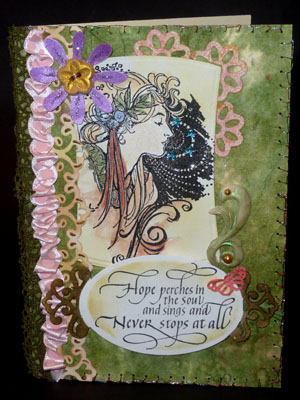 "Vintage - Hope Perches" card This weeks theme is the Vintage I just got this stamp image of the lady - you know I don't do people - but I thought she was a beautiful image and couldn't resist... (Stampendous "Deco Lady #CRP118). I also won a set of Spellbinders Wonky Reverse rectangles and wanted to use them too. And then I also got a batch of some of the other new Spellbinders and used the Parisian Accents and Floral Doily Motifs for this card. The quote is from Quietfire Design. |