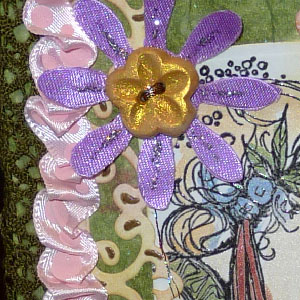 but it has a beautiful soft shimmer to it. Trimmed off the excess. Threaded a variegated metallic thread and did a blanket stitch around the card, first using Tim's ruler to pierce holes equidistant from each other and along a straight line (BIG GRIN). Stamped the lady with Versafine Black Onyx, clear embossed and colored with some pearlescent watercolors. Die cut with the Wonky rectangles, sponged some Scattered Straw to tone down the white cardstock. Adhered to my card. Added the mini pale blue stars and silver Stickles in that black area. Die cut the long border from the Parisian Accents set, sponged with the Frayed Burlap, clear embossed, then went over everything with the Straw. Adhered it to the card overlapping the wonky rectangle slightly. Took a piece of pink spotted ribbon and ruffled it "wonkily" on a piece of double sided tape, adhered to card over the border piece. Adhered a piece of olive toned lace under the ruffle and off the edge of the card. Die cut the flower piece from the Floral Doily set, sponged with Worn Lipstick, clear embossed then went over it with the Straw, cut it either in half or at an angle to fit along the wonky rectangle. Die cut the purple silk flower (Tim's Sizzix "Tattered Flower" die), added a vein with the silver Stickles and sewed on the button made from Air Dry Polymer Clay by Lumina, and painted with Perfect Pearls gold. |