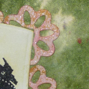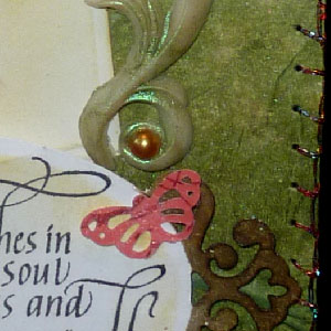 The flourish is also made from Lumina and painted with green perfect Pearls and gold half pearls added. Butterfly is punched out (Martha Stewart Punch Around the Page "Monarch Butterfly") from some left over paper on my desk and cut off from the border. The quote is stamped on white cardstock with the black. I used my rubber mallet to cut out the oval (oval die set) and the fancy detail on either end with the Parisian Accents die. I sponged the ends with the Burlap and clear embossed, then sponged the oval with the straw, masking the appropriate areas. I used pop dots to have it stand off of the card. |