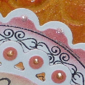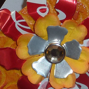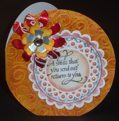 small flat area on the bottom so the card wouldn't roll around... Sponged Distress stamp pads Scattered Straw & Mustard Seed. Ran through embossing machine with the Sizzix Swirls embossing folder. Swiped Worn Lipstick on the high points and clear embossed. Die cut the Spellbinders Beaded Circle from white cardstock, dry embossing and then coloring with Worn Lipstick. Stamped a decorative border (Just Rite "Plant a Little Love" set) with Versafine Black Onyx. Die cut a smaller Spellbinders Beaded Circle sponging some Scattered Straw and some Lipstick. Stamped the quote with the black. Adhered one beaded circle to the other, then onto the card. Die cut the flower with Tim's Sizzix Tattered Flower die from a Cola can, using the right side this time. Added a yellow toned paper flower and then another die cut but the inside of the can this time. Attached them all together and to the card with a large rhinestone jewelled brad. As a final touch added dots of Liquid Pearls "Buttercup" & Stickles Distress "Picket Fence" |