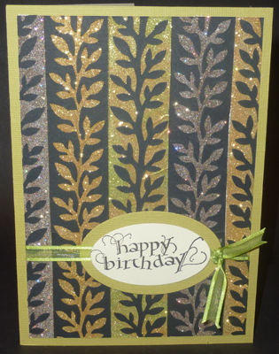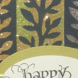 "Glitter - MS Vine Trim HB" card This weeks theme is the color Glitter. I picked up a couple new Martha Stewart Double Edge punches which I just love. I layered each strip of Sookwang tape with either the positive or the negative of the vine trim, then added various glitters, gold, or gold mixed with chartreuse, or my mixed from everything glitter. Layered it onto an olive Bazzill monochrome cardstock and then edge to edge on a cream toned card. I stamped the sentiment (Quietfire Design.) with Versafine black and cut out both layers with a Spellbinders Nestabilities oval die set, adding the ribbon between the layers and tying a knot. |