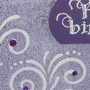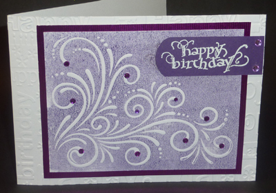 "Stencils - Large Flourish HB" card This weeks theme is Stencils. I love this stencil by Lynell Harlow #LJ896. Now I could have gone the traditional way and added embossing paste, but decided to put it through my embossing machine. I first inked up the surface of the stencil with Distress Dusty Concord, lay my cardstock carefully on top and made my machine's sandwich. I immediately clear embossed the surface. I love the textural/granular look of the embossing. I trimmed it down and layered it onto to a heavy textured bright rose metallic cardstock, then on to my main white, side folded card which I embossed with the Happy Birthday folder. I stamped the sentiment (Quietfire Design.) with pigment ink and embossed with Detail White. trimmed and rounded the corners. As a final detail I added rose toned rhinestones and the two mauve rhinestones. |