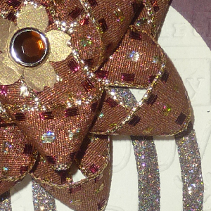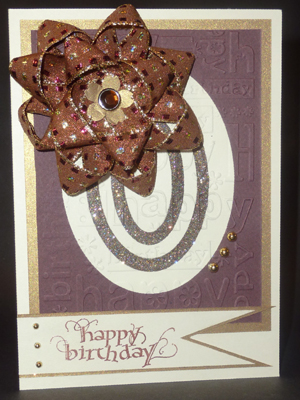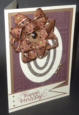 So the basic instructions for the bow are: cut 8 pcs of paper 3/4"w x 6" long, 4 x 5" long and 1 by 4" long. The 1 piece replaces the flower I have in the center and is glued to create a circle. The others are glued to their ends in an overlapping twist. Then holes punched in those ends and then layered and held together with a brad. Instead I made mine with 1/2" ribbon 8 x 4.5", 4 x 3.5" and the Sakura punched flower from some gold paper. I didn't bother gluing the ends, I just punched my holes, and started loading them on to the dark amber large rhinestone brad. Worked just fine that way. As I mentioned I cut my ovals, these were from cream toned cardstock, the glitter is a mix of all my discards and has a nice tone to it - figured might as well start using it up. It's assembled into a burgundy rectangle, then the whole assembly is embossed with the Happy Birthday Cuttlebug folder. Layered on to a gold Precious Metals cardstock and on to the main cream toned card. I stamped the sentiment with Aged Mahogany Distress, clear embossed and cut it out with points, then layered it to the gold and onto the card. Added 3 small gold half pearls and 3 larger half pearls near the ovals. |