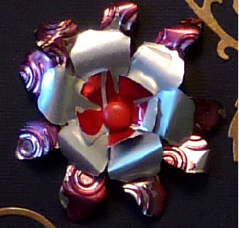 Cola flower: I die cut the flowers segments using Tim's Tattered Flowers Sizzix die, ran the bottom one through with a Cuttlebug D'Vine Swirls folder and colored with Alcohol inks. the second layer I left as is in silver. The top layer is the cola side. attached them with a large red brad and onto a small cardstock circle.