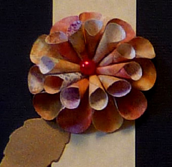 Pinched circle flower: Another flower I haven't done before. I smeared some white cardstock through Distress inks (Mustard Yellow, Barn Door, Dried Marigold) on my craft mat that was also misted with water. Allowed to dry. Punched out 3/4" circles, slit them to almost the center, then overlapped them and adhered the edges with a dab of glue. When dry, pinched the overlapped area. Punched out a 3/4" circle and put glue all over, then assembled them overlapping slightly. continued to the center. allowed to dry. Pierced a hole in center and added the floral stamen. |