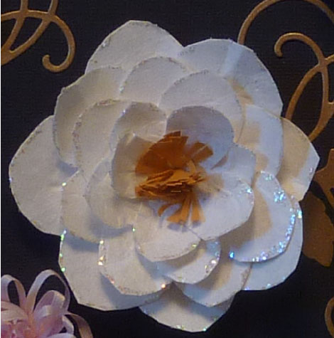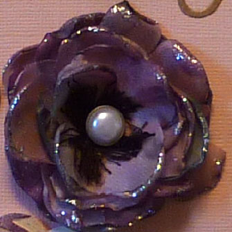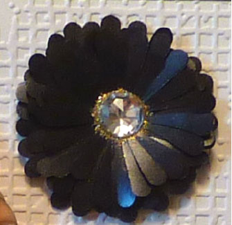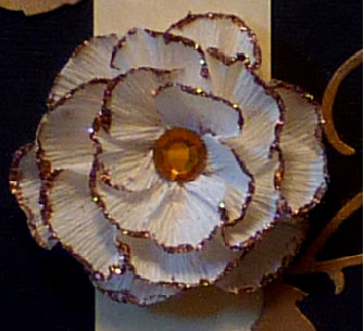 Crêpe Flower: This is the first time I made this flower, but it's based on flowers I see in stores. Punch out a bunch of circles and following the grain of the crêpe, put some glue at the bottom edge and pinch. Then using your thumb, shape the bowl of the petal. Set aside and do all the rest. The outer layers are 1" circles and the inner section are 3/4" circles. Put a bit of glue on the upper edge of each petal with the tip of a bamboo skewer, then scoop into some glitter (Stampendous Light Copper) and allow to dry. Assembly - punch out a 3/4" white cardstock circle, put a bead of glue from the edge to about half way into the circle. Start adhering the petals overlapping them slightly. Do a second row, then add more glue and do the small petals. Add a large rhinestone. |