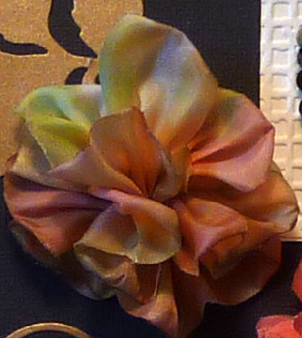 Singed scallop strip flowers: I folded a piece of polyester white fabric a bunch of times, then cut a large scalloped edge on one side. Colored the material with Adirondack Colorwash Raisin, Glimmer Mists Red Velvet, and ran a Distress Pad Mustard Seed in the open areas. Misted well with water, then dried. Held the edge over a candle flame (careful it can catch fire very easily so use safety measures) until the fabric curled. Did a running stitch and gathered then joined the edges together. Adhered it to a punched circle with Golden's Extra Heavy gel medium. I find adhering these types of flowers onto cardstock, makes it easier to then add it to a project with just some regular glue. |
