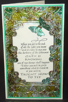 Created: May 6, 2011 This weeks theme is the Emerald or Glitter This is such a nice Embossing Plus folder and I just don't use it enough. I've used a quote by Quietfire Design. |